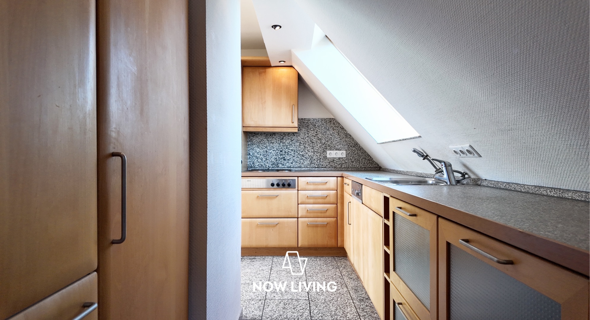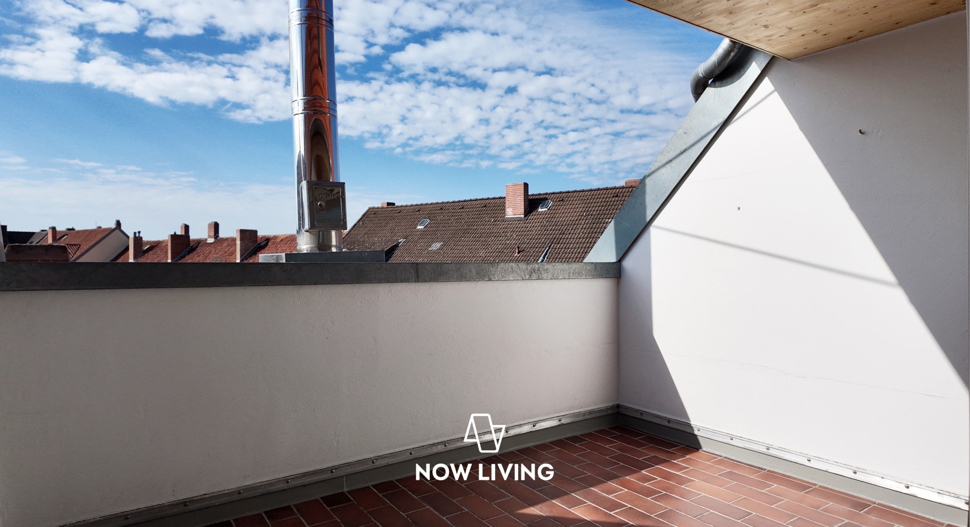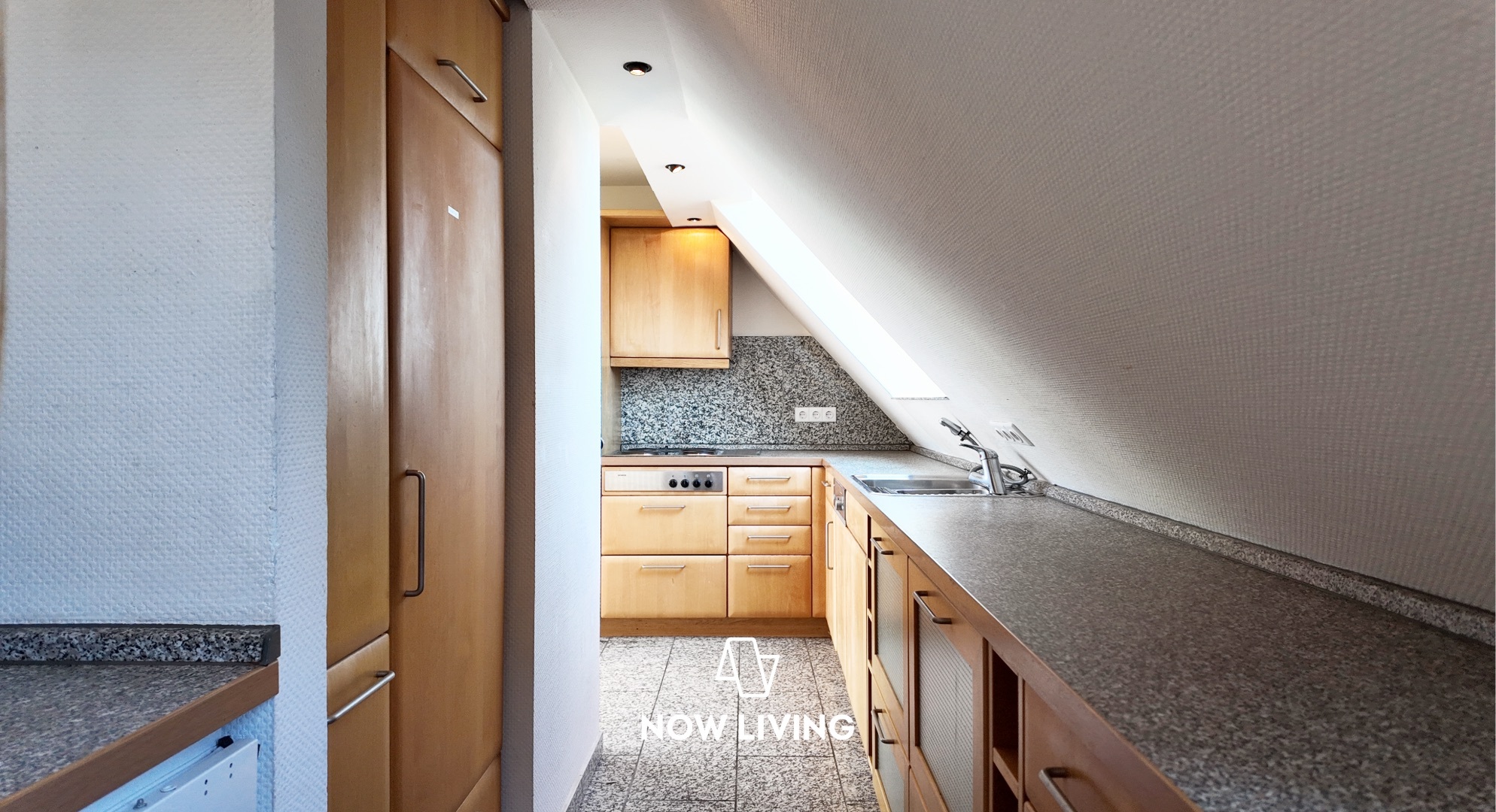 Diese außergewöhnliche Dachgeschosswohnung im 5. Obergeschoss vereint großzügiges Wohnen mit gemütlichem Dachgeschossflair. Auf einer Grundfläche von ca. 135,44 m² (offizielle Wohnfläche ca. 85 m²) bietet sie vier Zimmer, zwei Bäder, eine Loggia sowie vielseitige Abstell- und Gestaltungsmöglichkeiten. Der zentrale Wohn- und Essbereich beeindruckt mit seiner besonderen Raumhöhe bis unter den Giebel und schafft ein luftiges, offenes Wohngefühl. Die offene Küche mit Thekenbereich fügt sich harmonisch ein und ermöglicht kurze Wege auf die halb überdachte Loggia. Von hier genießen Sie einen entspannten Blick in den grünen Innenhof und über die Dächer der Umgebung.