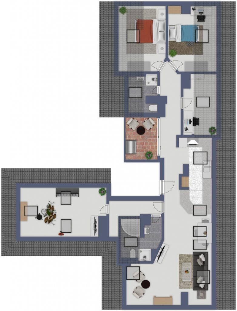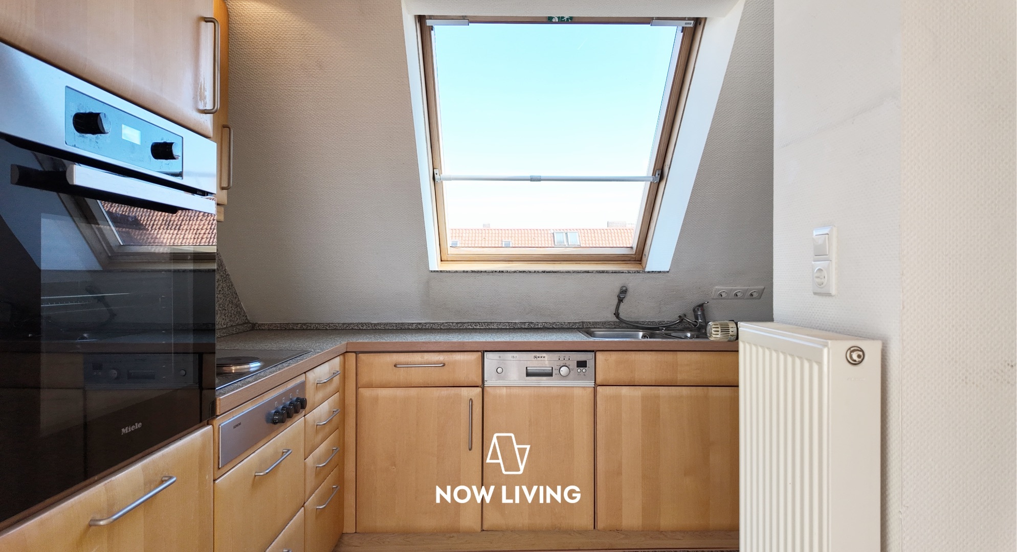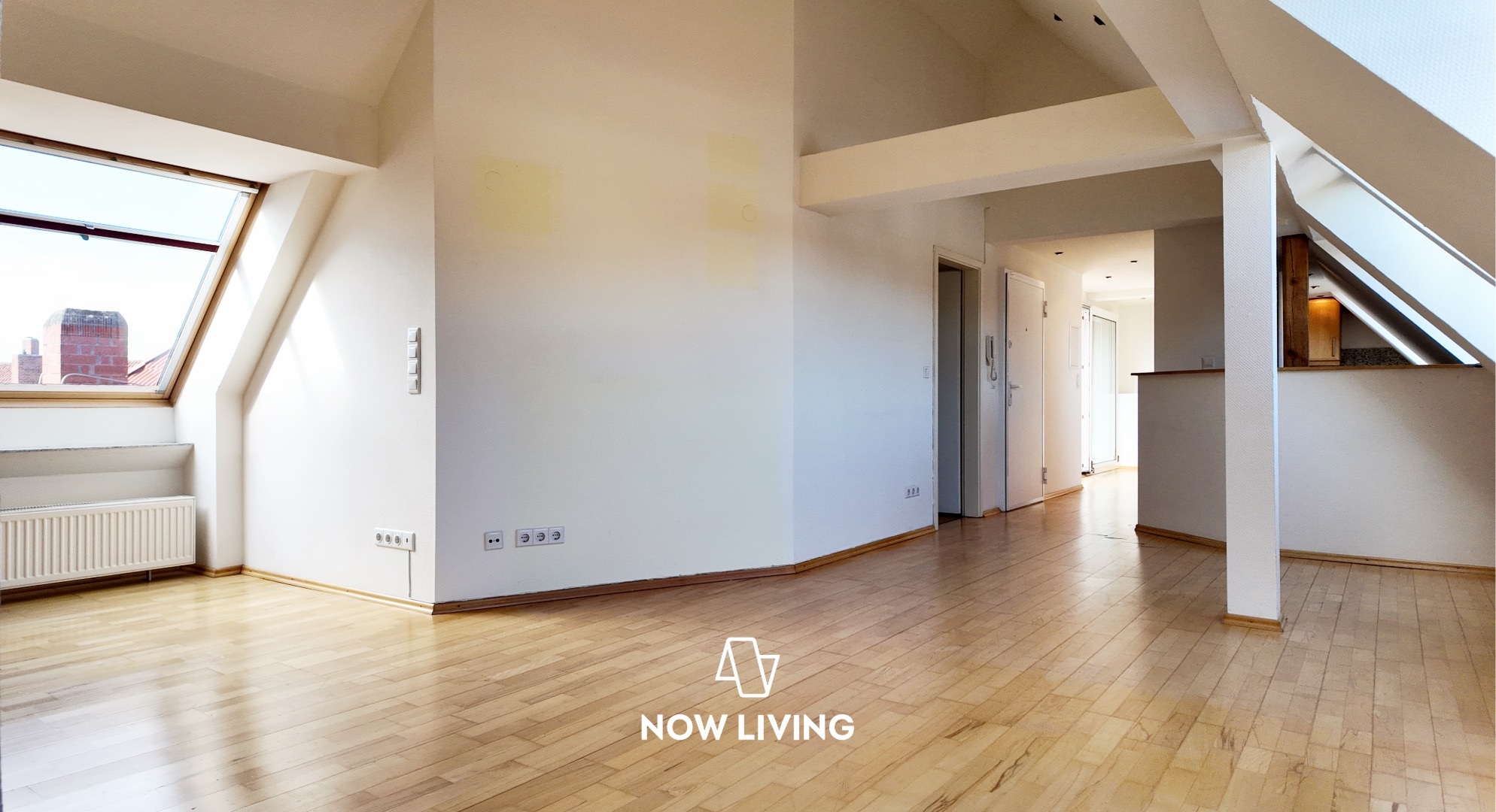 Diese außergewöhnliche Dachgeschosswohnung im 5. Obergeschoss vereint großzügiges Wohnen mit gemütlichem Dachgeschossflair. Auf einer Grundfläche von ca. 135,44 m² (offizielle Wohnfläche ca. 85 m²) bietet sie vier Zimmer, zwei Bäder, eine Loggia sowie vielseitige Abstell- und Gestaltungsmöglichkeiten. Der zentrale Wohn- und Essbereich beeindruckt mit seiner besonderen Raumhöhe bis unter den Giebel und schafft ein luftiges, offenes Wohngefühl. Die offene Küche mit Thekenbereich fügt sich harmonisch ein und ermöglicht kurze Wege auf die halb überdachte Loggia. Von hier genießen Sie einen entspannten Blick in den grünen Innenhof und über die Dächer der Umgebung.