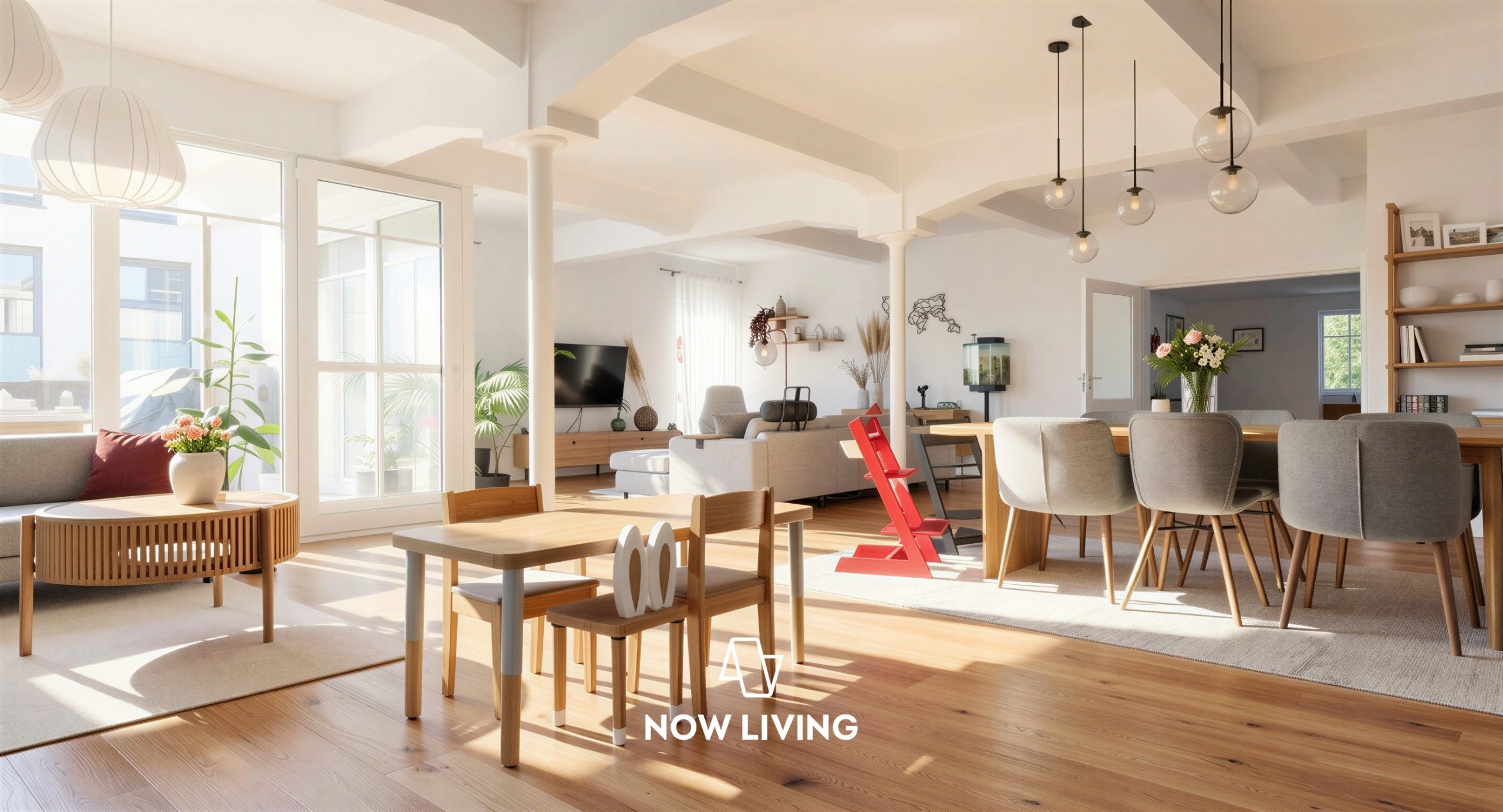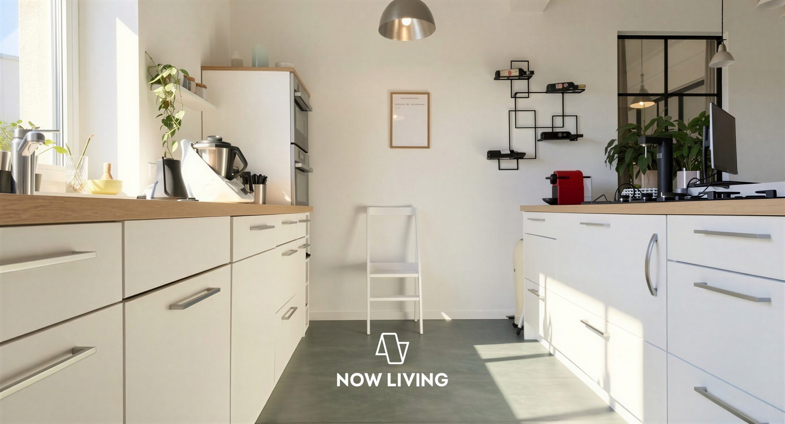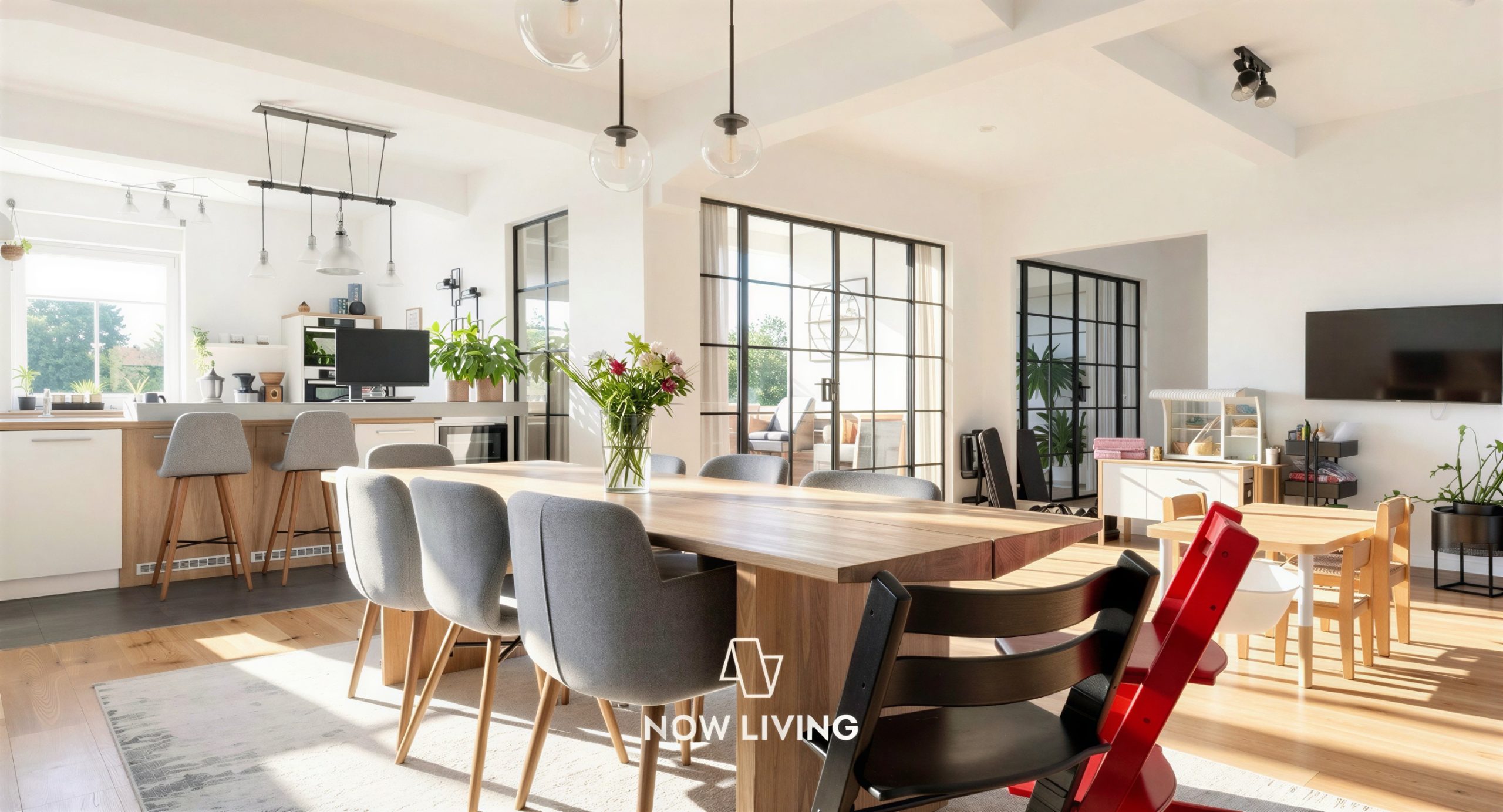 Schon beim Eintreten spürt man: Hier wird nicht in Zimmern gedacht, sondern in Weite. Fünf Räume, die sich nicht aneinanderreihen, sondern entfalten. Der offene Wohn-, Ess- und Küchenbereich ist das kraftvolle Zentrum – ein Raum für Alltag und Ausnahme zugleich. Hier wird gekocht, gearbeitet, diskutiert, gefeiert. Die hochwertige Einbauküche mit E-Geräten ist kein späteres Projekt, sondern integraler Bestandteil. Alles ist bereit.