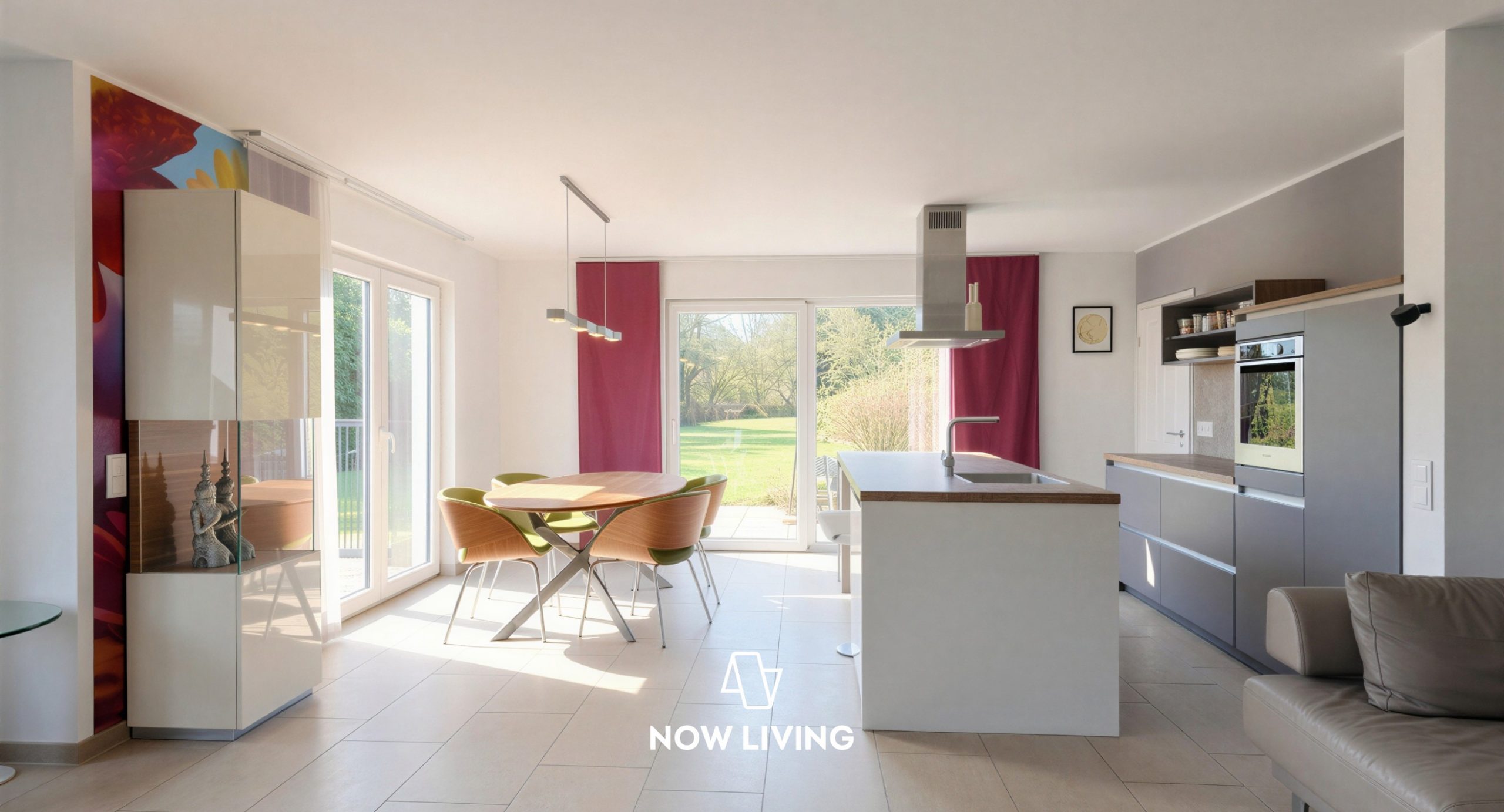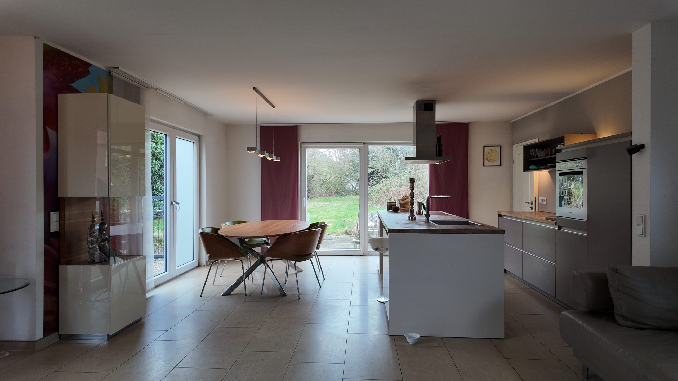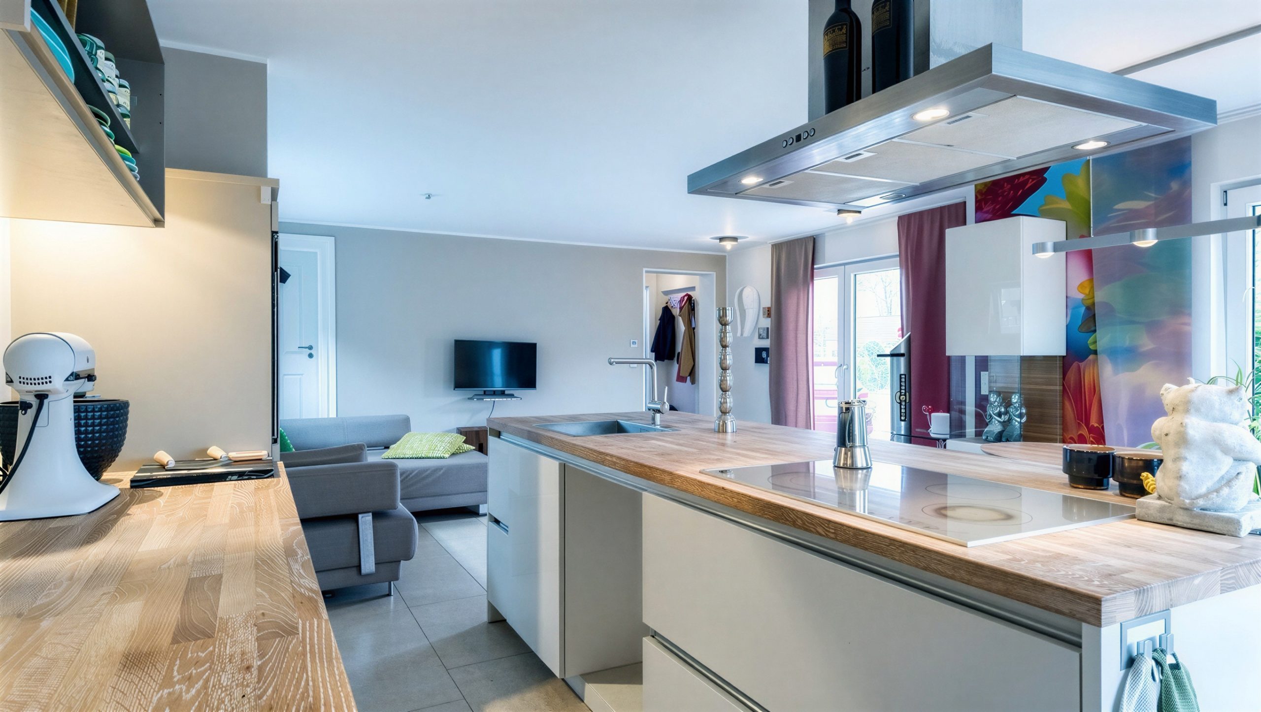 Das Herzstück des Hauses bildet die beeindruckende, offene Wohnküche mit über 44 m² Fläche. Hier verschmelzen Kochen, Essen und Wohnen zu einem großzügigen Lebensmittelpunkt für die ganze Familie. Die moderne Einbauküche mit Kochinsel und massiver Holzarbeitsplatte überzeugt sowohl optisch als auch funktional. Große Fensterflächen sorgen für eine helle und freundliche Atmosphäre und ermöglichen den direkten Zugang zur sonnigen Terrasse. Der angrenzende Wohnbereich fügt sich harmonisch in das offene Raumkonzept ein und lädt zu entspannten Stunden im Kreise der Familie ein.