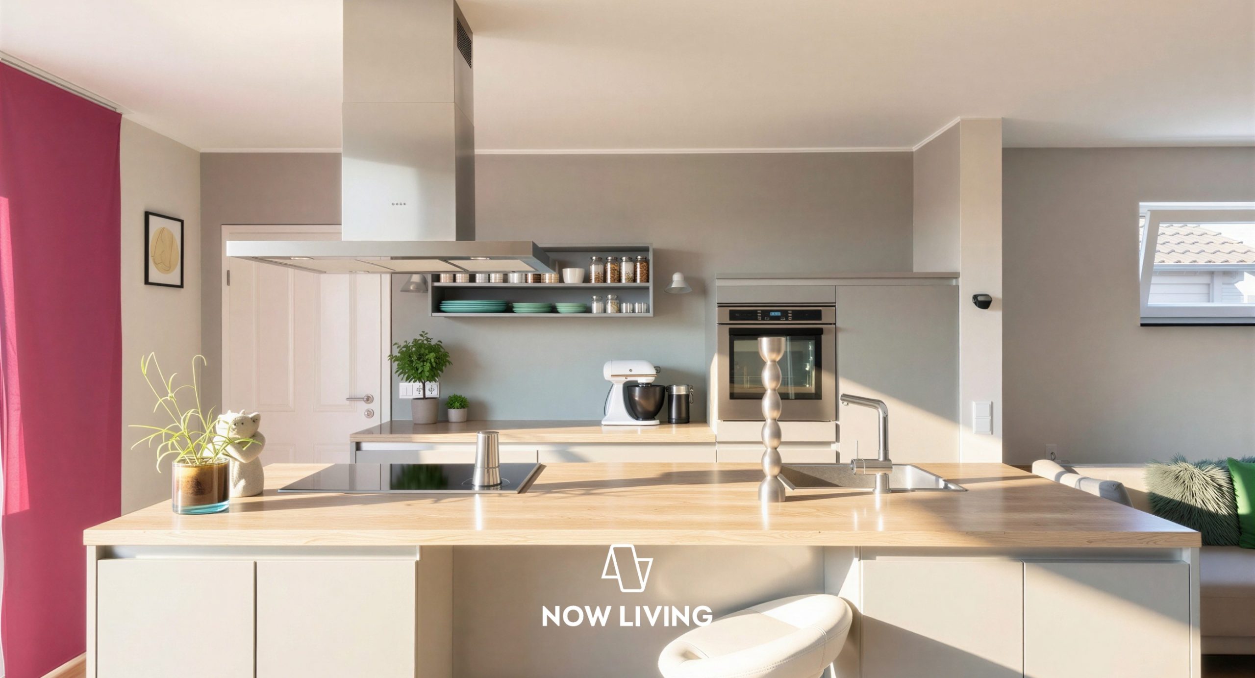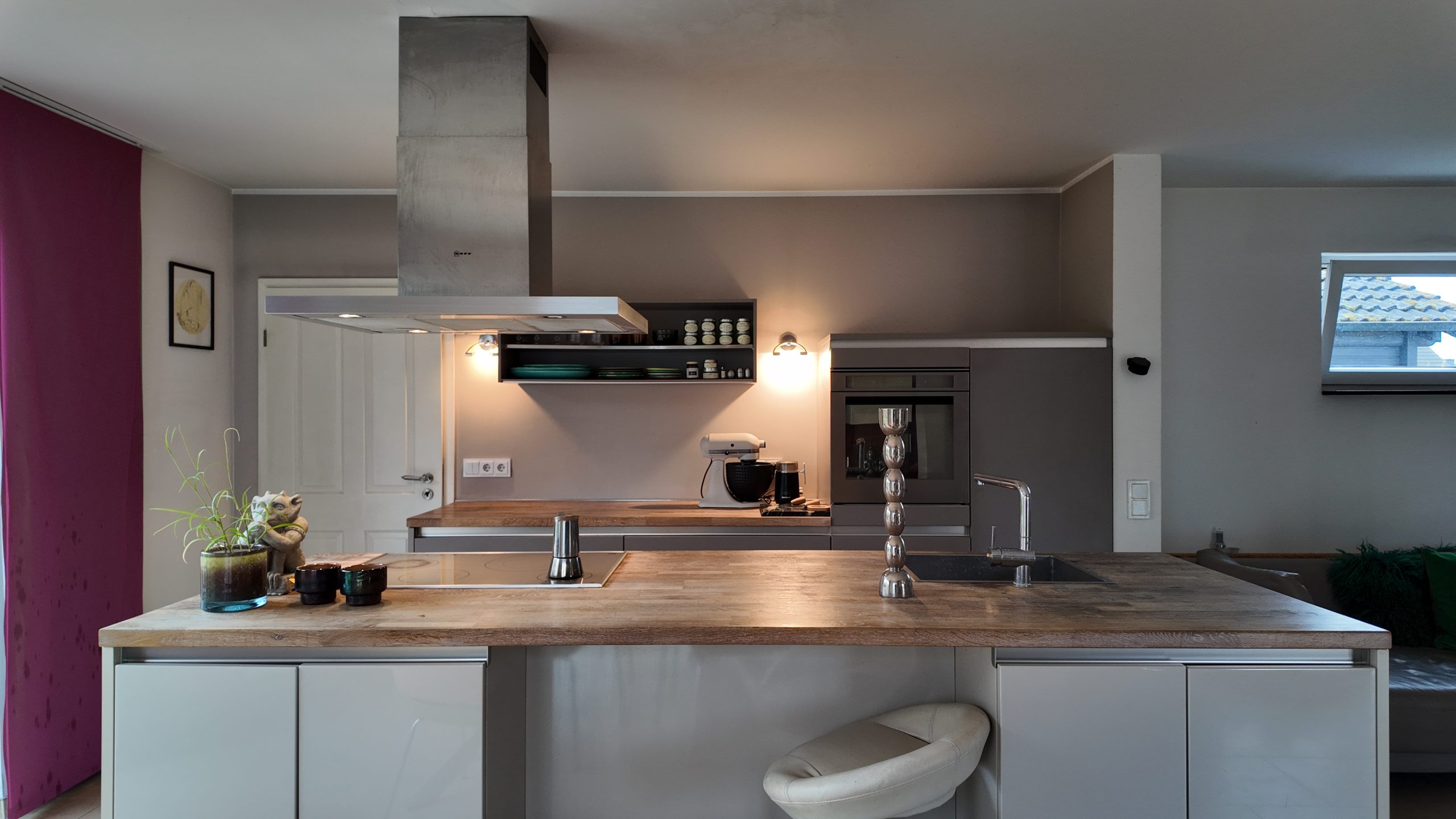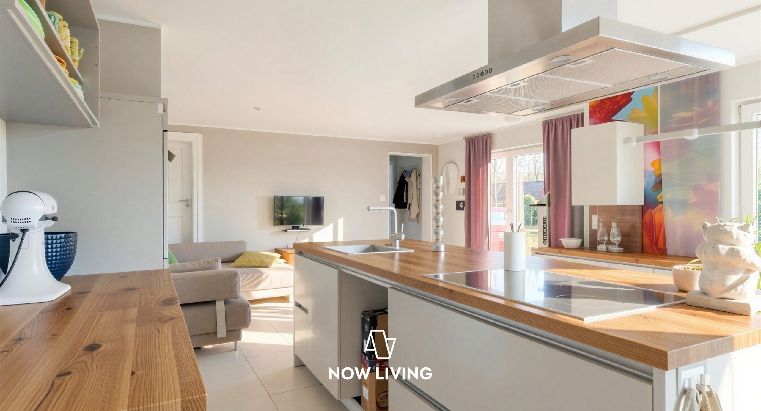 Das Herzstück des Hauses bildet die beeindruckende, offene Wohnküche mit über 44 m² Fläche. Hier verschmelzen Kochen, Essen und Wohnen zu einem großzügigen Lebensmittelpunkt für die ganze Familie. Die moderne Einbauküche mit Kochinsel und massiver Holzarbeitsplatte überzeugt sowohl optisch als auch funktional. Große Fensterflächen sorgen für eine helle und freundliche Atmosphäre und ermöglichen den direkten Zugang zur sonnigen Terrasse. Der angrenzende Wohnbereich fügt sich harmonisch in das offene Raumkonzept ein und lädt zu entspannten Stunden im Kreise der Familie ein.