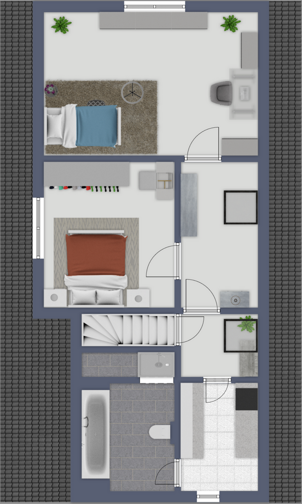 Im Obergeschoss erwartet Sie eine durchdachte Raumaufteilung mit zwei gut geschnittenen Schlafzimmern, die sich flexibel als Kinder-, Gäste- oder Arbeitszimmer nutzen lassen. Ergänzt wird diese Ebene durch eine separate Küche sowie ein großzügiges Badezimmer mit Badewanne und Dusche, das Komfort und Alltagstauglichkeit ideal vereint.