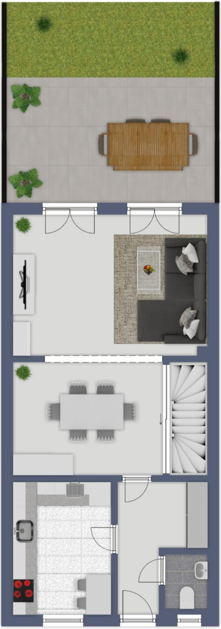 Schon beim Betreten fühlen Sie sich willkommen: Der helle Flur mit Platz für die Garderobe öffnet den Weg ins Haus. Gleich daneben das praktische Gäste-WC und die Küche – der perfekte Ort, um gemeinsam zu kochen oder Freunde am Esstisch zu versammeln. Das Herzstück des Hauses ist der offene Wohn- und Essbereich, lichtdurchflutet und mit direktem Zugang auf die Terrasse. Hier geht’s nahtlos weiter in den grünen Garten, der zum Entspannen, Spielen oder Feiern einlädt.