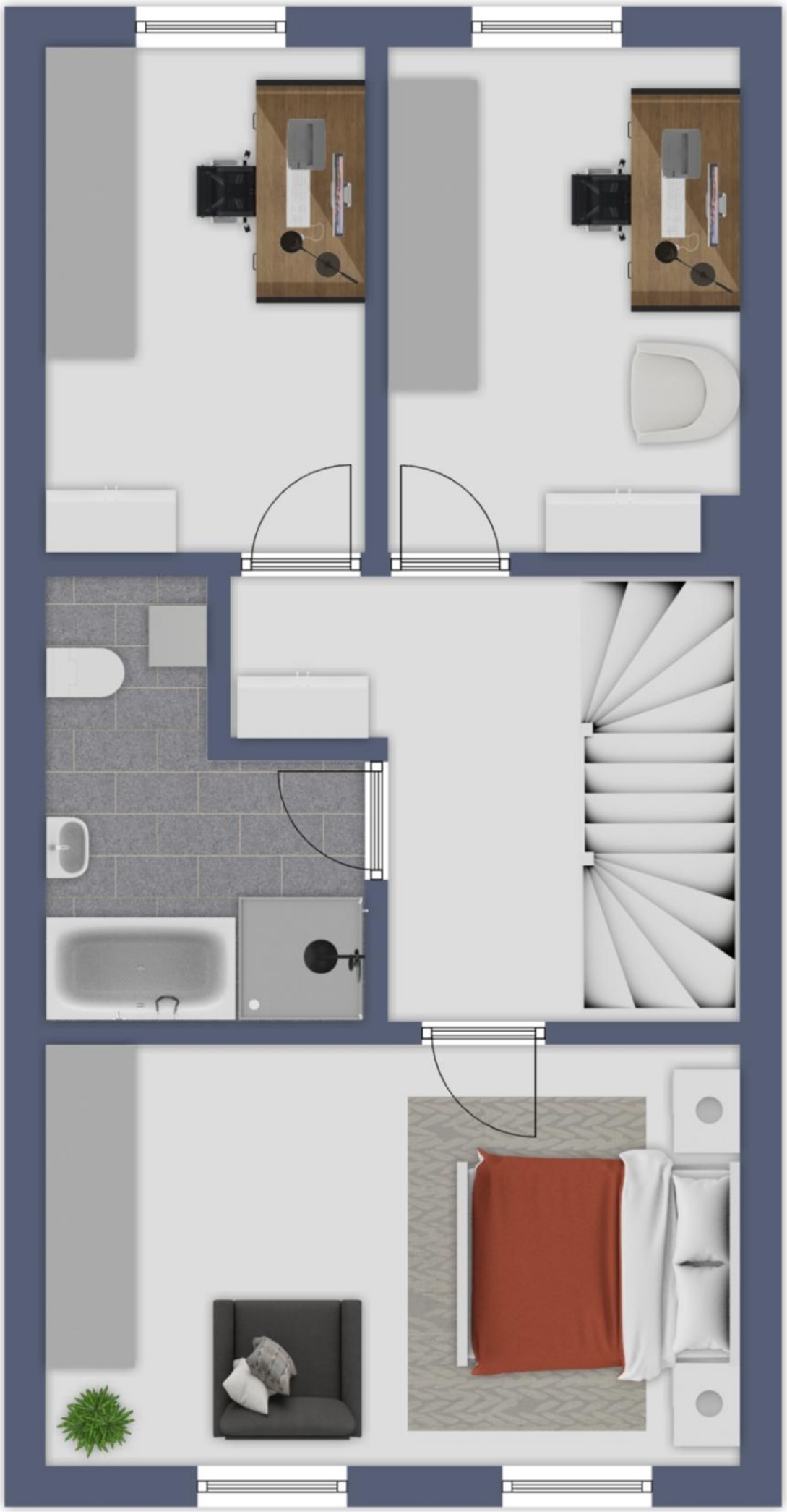 Im Obergeschoss wartet ein großzügiges Schlafzimmer auf Sie, dazu zwei weitere Zimmer, die je nach Lebensphase flexibel Kinderzimmer, Homeoffice oder Gästezimmer sein können. Das Badezimmer mit Wanne und Dusche macht den Alltag unkompliziert.