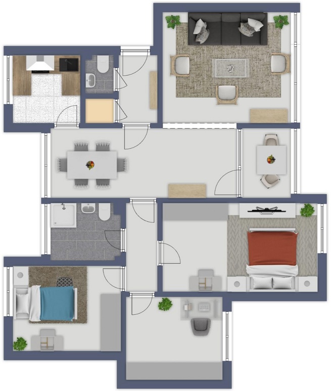 Das Raumangebot umfasst einen hellen Wohn- und Essbereich mit Balkonzugang, drei Schlafzimmer, eine separate Küche, ein Tageslichtbad mit Dusche, ein Gäste-WC sowie einen praktischen Abstellraum. Große Fenster sorgen für viel Licht. Zur Wohnung gehören außerdem zwei Außenstellplätze und ein Kellerraum.