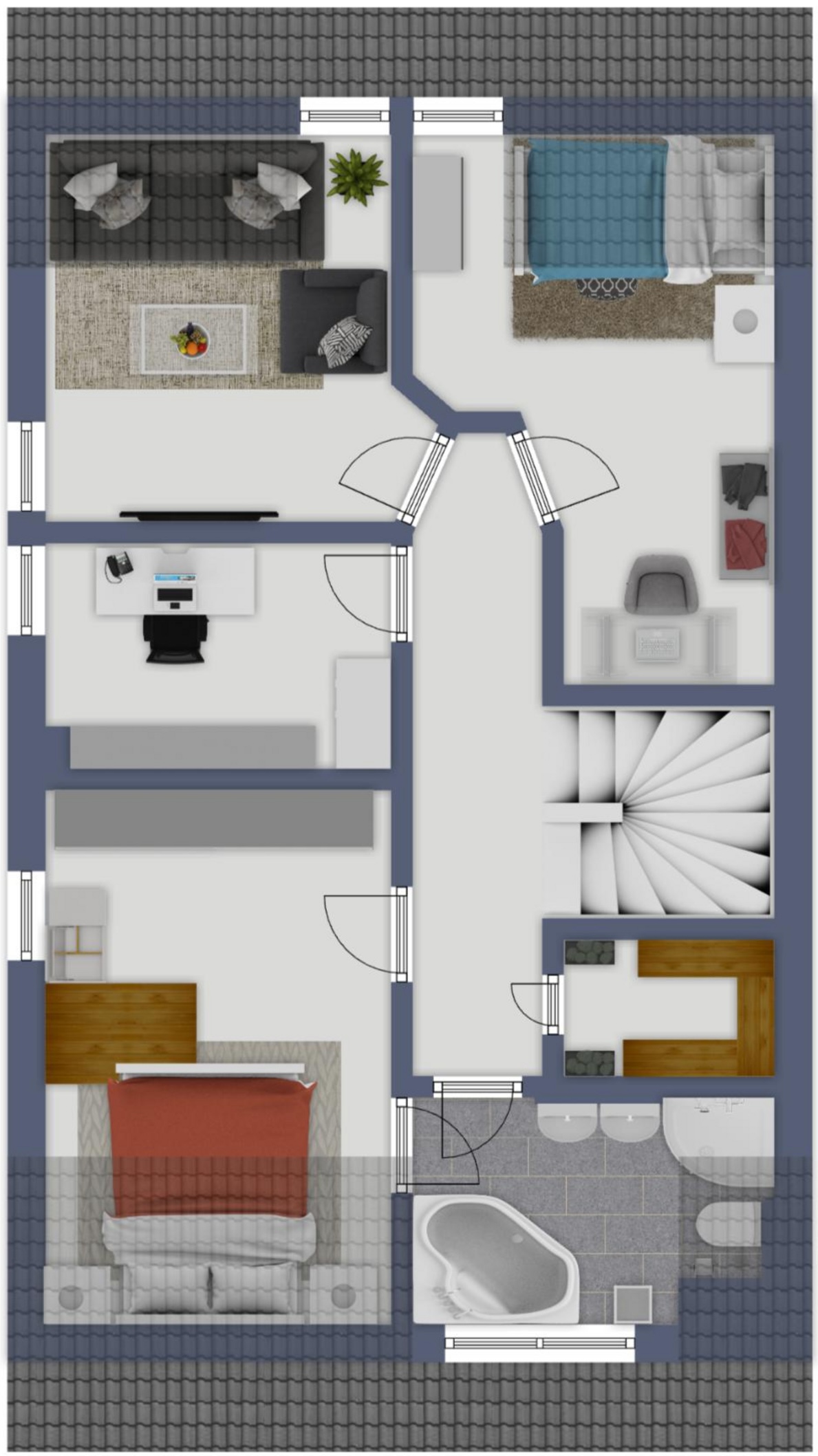 Im Obergeschoss wartet das Familienbad mit Badewanne und Dusche – perfekt, wenn morgens mal alle gleichzeitig „startklar“ werden müssen. Und das kleine Extra, das man im Alltag schnell lieben lernt: die Sauna im Obergeschoss. Einmal kurz abschalten, während der Rest des Hauses zur Ruhe kommt.