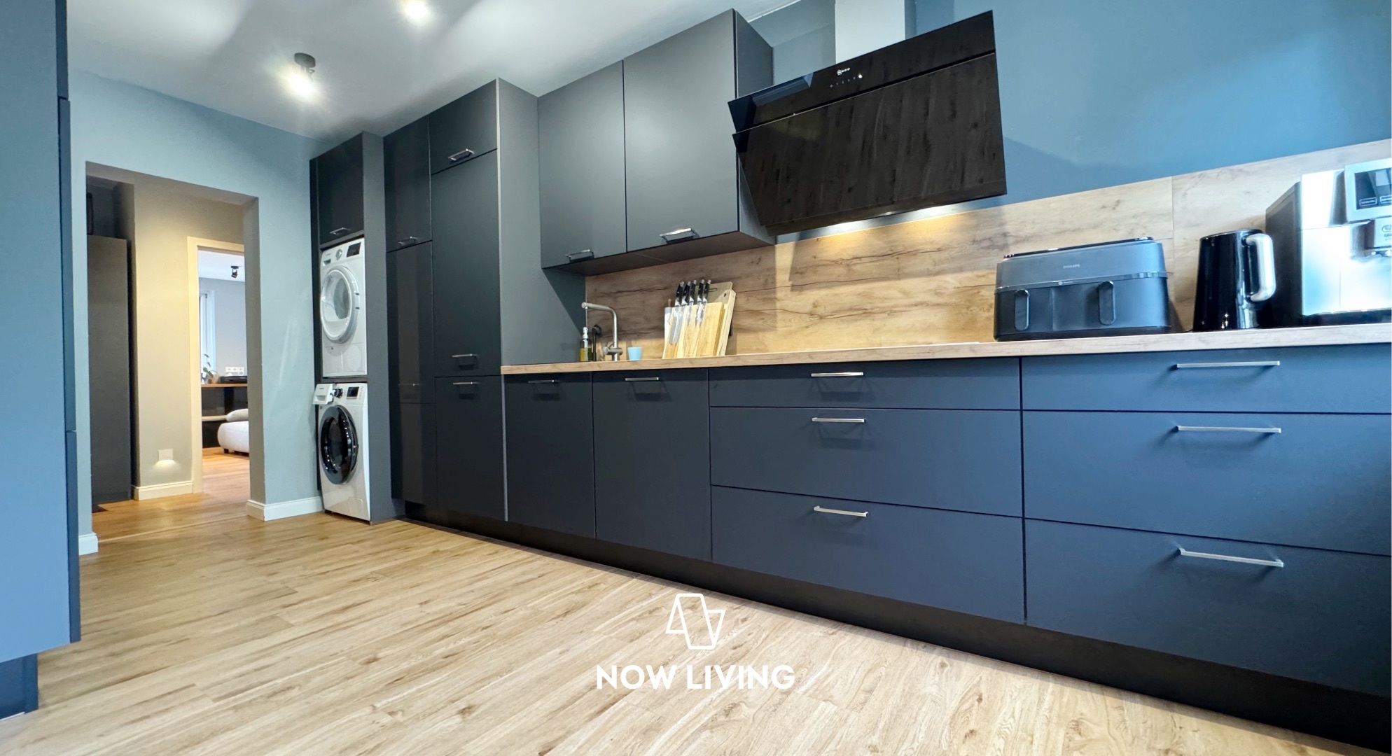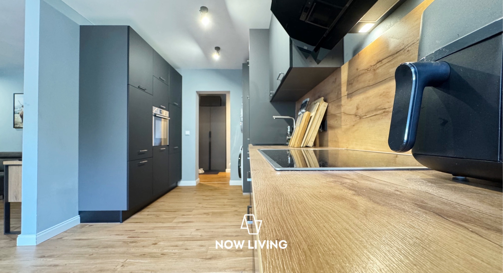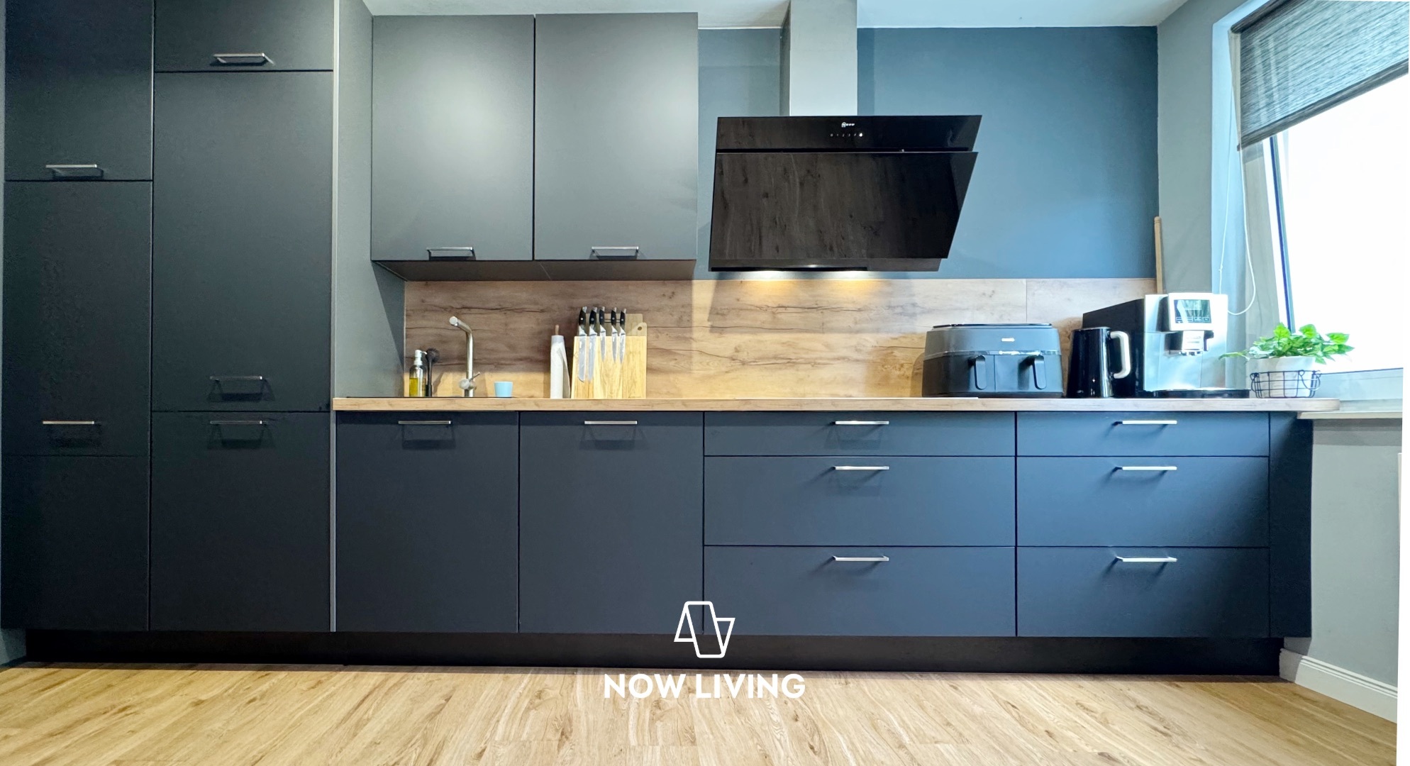 Besonderes Augenmerk liegt auf der hochwertigen Einbauküche der Marke Nobilia in Anthrazit-Matt mit Anti-Fingerprint-Beschichtung. Diese ist mit Marken-Elektrogeräten von Neff (Induktionskochfeld, Dunstabzugshaube, Backofen, Geschirrspüler) ausgestattet und bietet durch spezielle Schranklösungen zusätzlichen Stauraum.