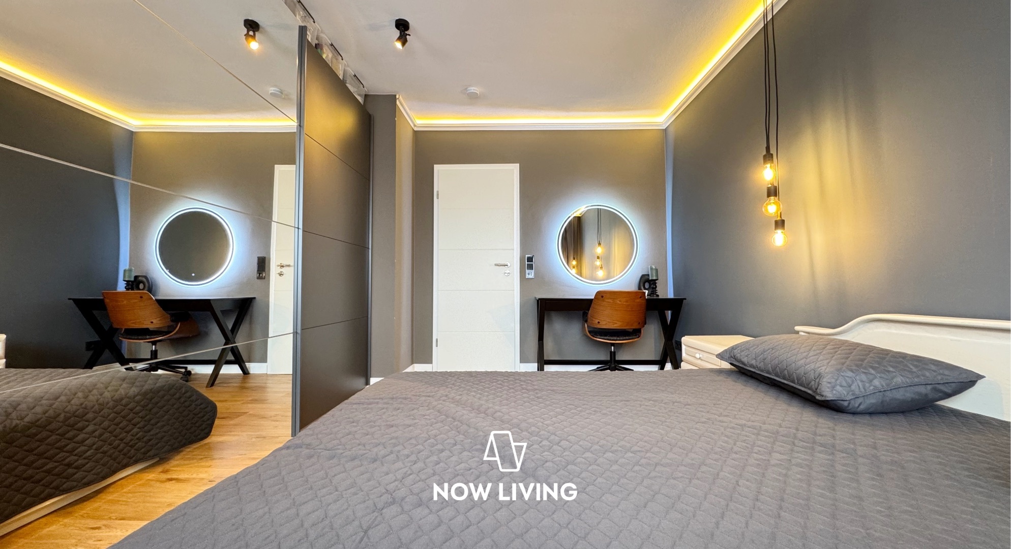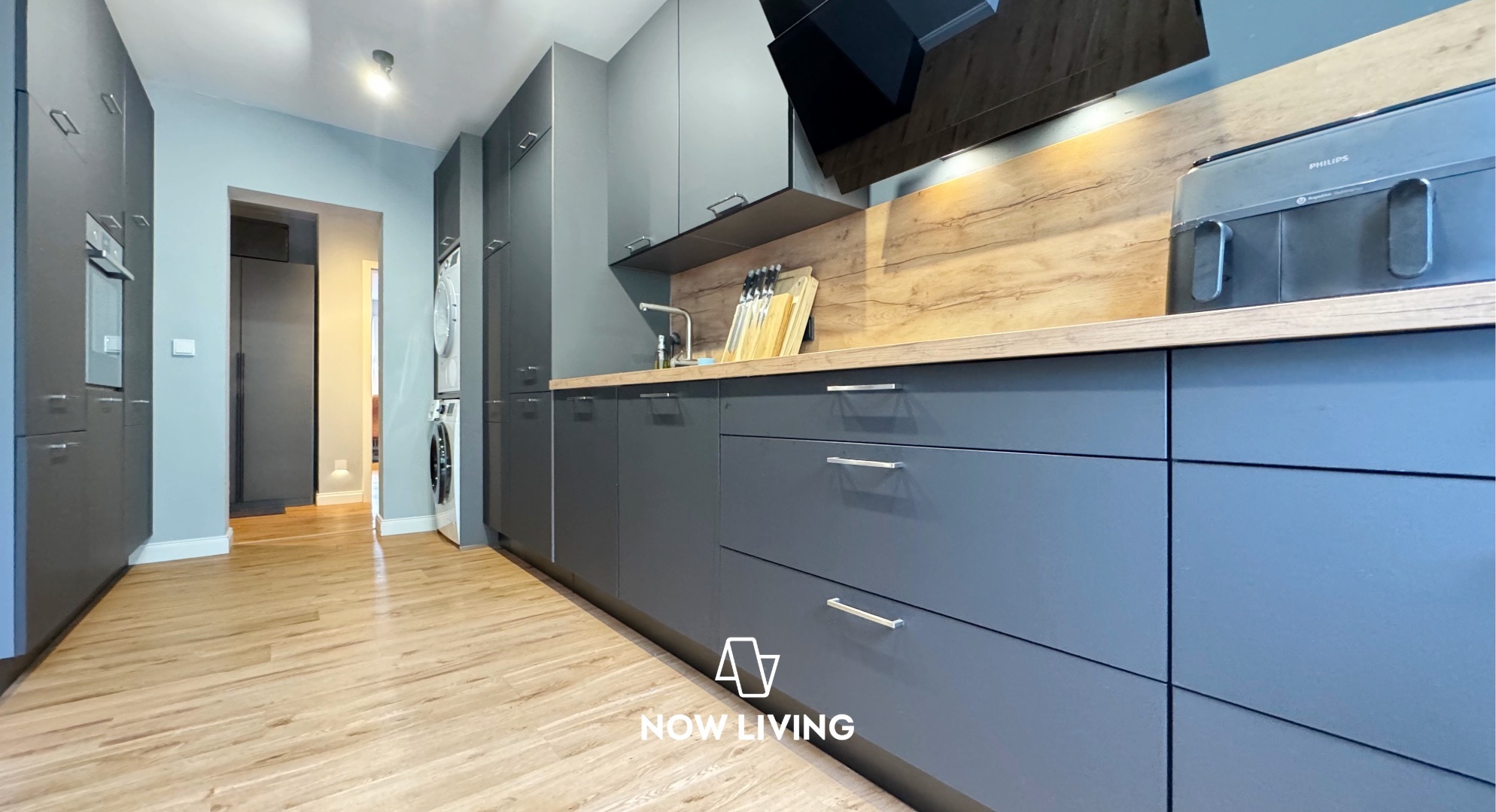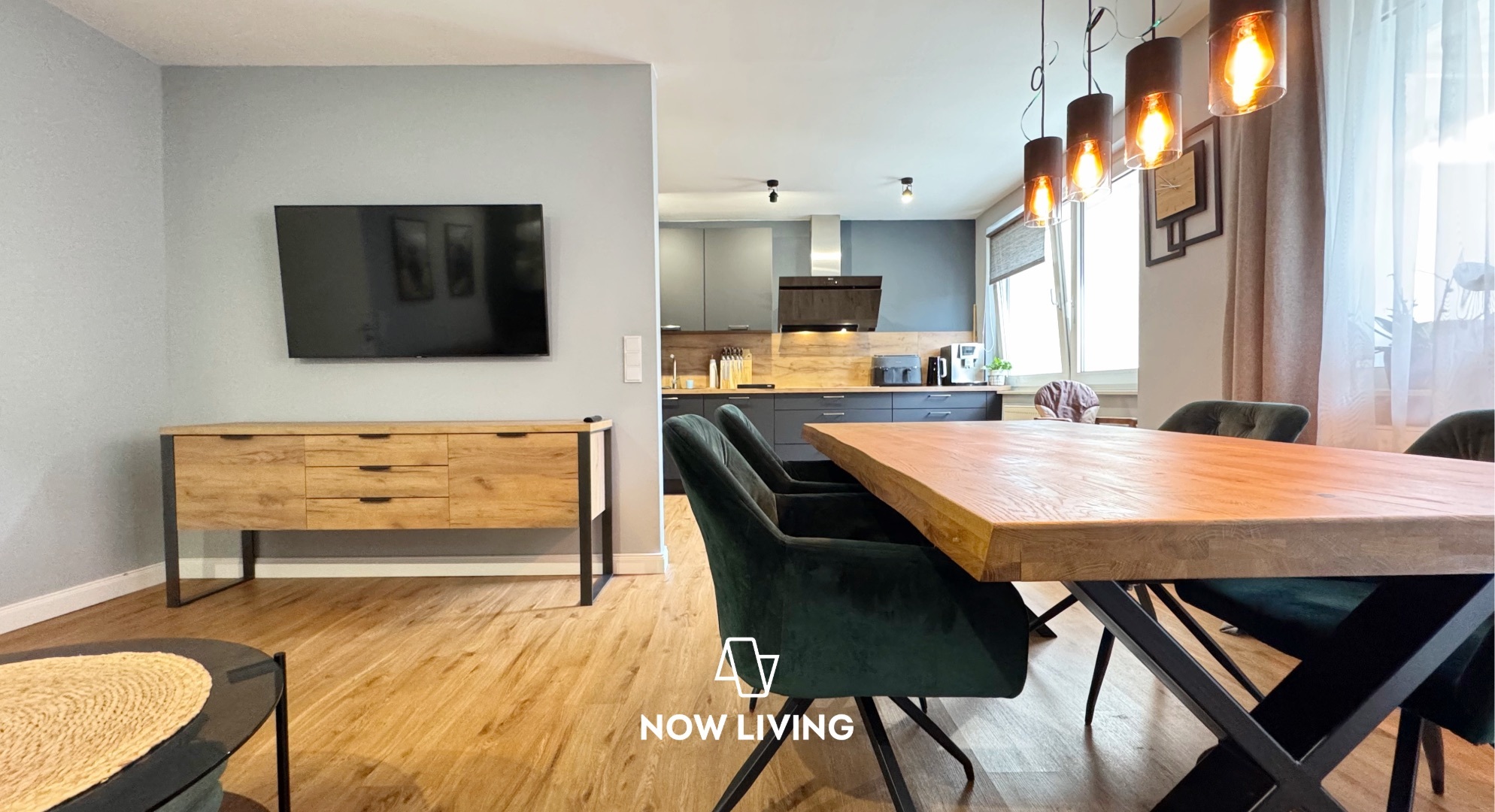 Besonderes Augenmerk liegt auf der hochwertigen Einbauküche der Marke Nobilia in Anthrazit-Matt mit Anti-Fingerprint-Beschichtung. Diese ist mit Marken-Elektrogeräten von Neff (Induktionskochfeld, Dunstabzugshaube, Backofen, Geschirrspüler) ausgestattet und bietet durch spezielle Schranklösungen zusätzlichen Stauraum.