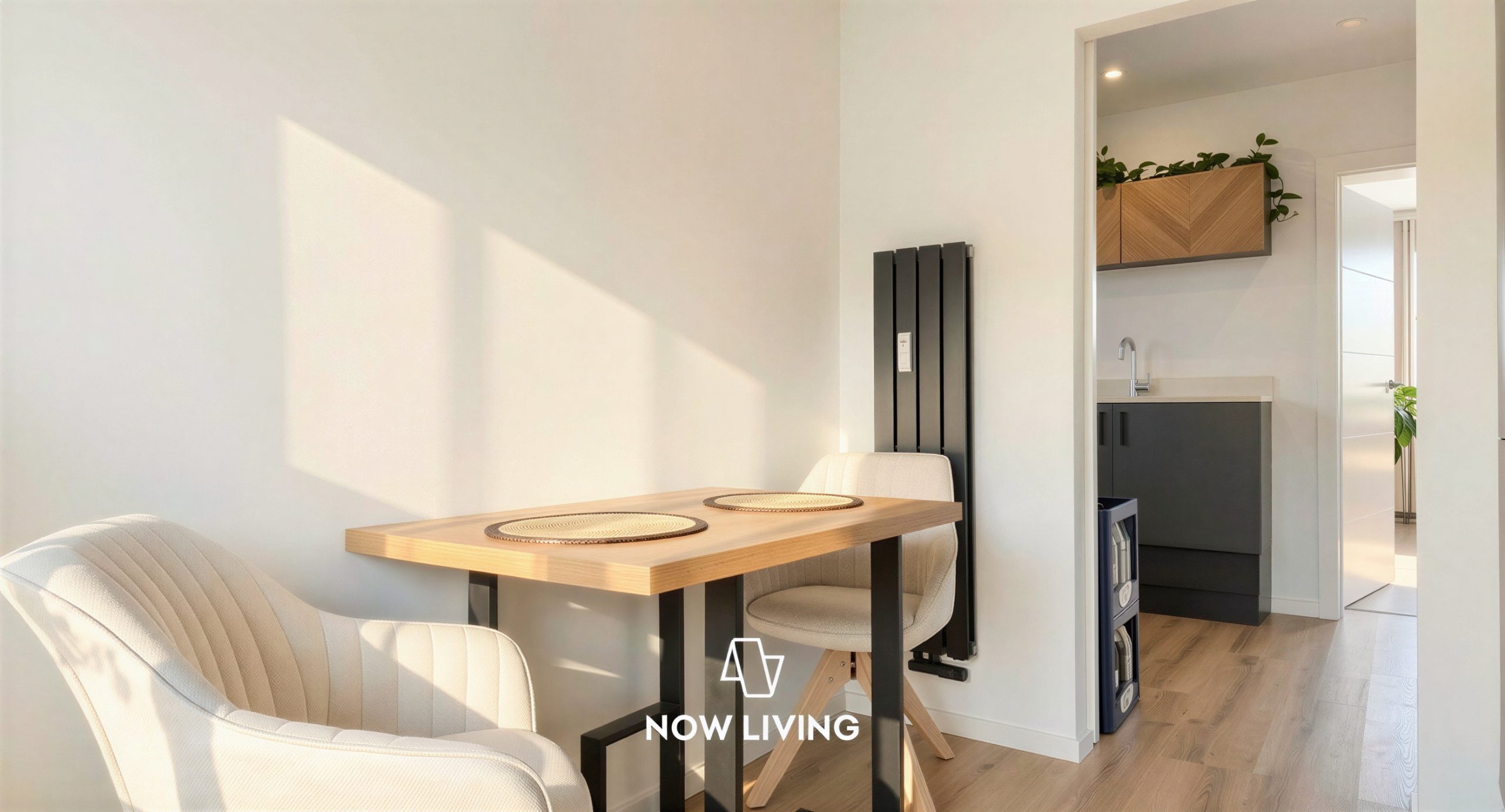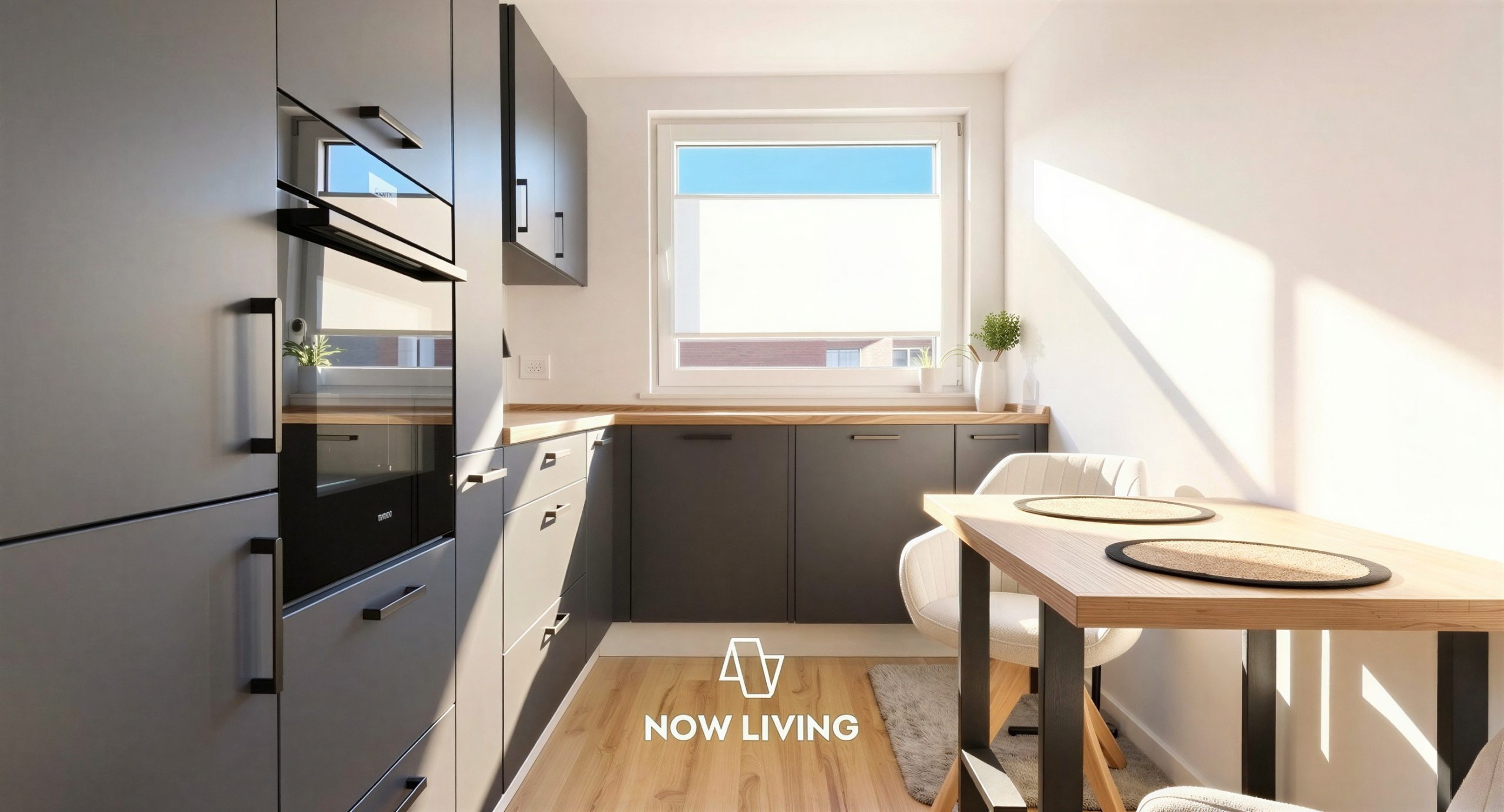 Der Grundriss ist offen, aber präzise. Der zentral angeordnete Wohn- und Essbereich bildet das funktionale Herz der Wohnung – lichtdurchflutet, ruhig und hochwertig ausgeführt. Die moderne Einbauküche mit hochwertigen NEFF-Geräten ist funktionaler wie gestalterischer Bestandteil des Wohnbereichs und auf Langlebigkeit ausgelegt.