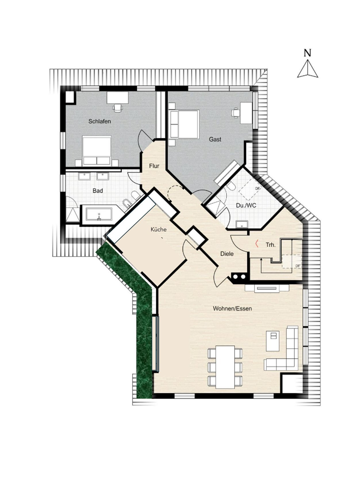 Im Erdgeschoss erwarten Sie vier helle, freundliche Zimmer, eine großzügige Küche, zwei Flure, ein Gäste-WC mit Dusche sowie ein luxuriöses Bad mit Wanne, Dusche und Doppelwaschbecken. Die große Terrasse mit Blick ins Grüne macht warme Abende zu echten Genussmomenten – elektrische Rollos sorgen für Komfort und Sicherheit.