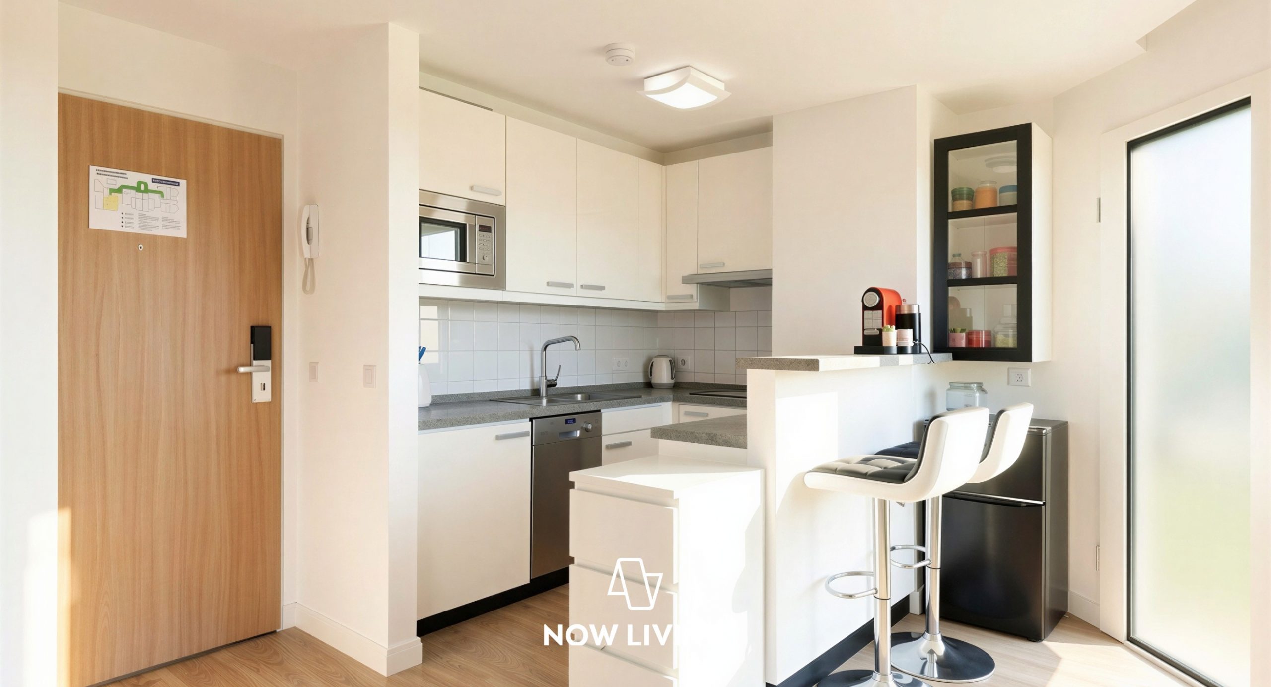 Der Wohnbereich öffnet sich weit und ruhig zum Innenhof. Große, bodentiefe Fenster holen das Licht tief in die Wohnung und schaffen eine Atmosphäre, die sich mit dem Tagesverlauf verändert. Die offene Küche mit Tresen ist nicht abgetrennt, sondern Teil des Raumes – kommunikativ, funktional und selbstverständlich integriert. Ein Ort, an dem Alltag und Wohnen ineinander übergehen.