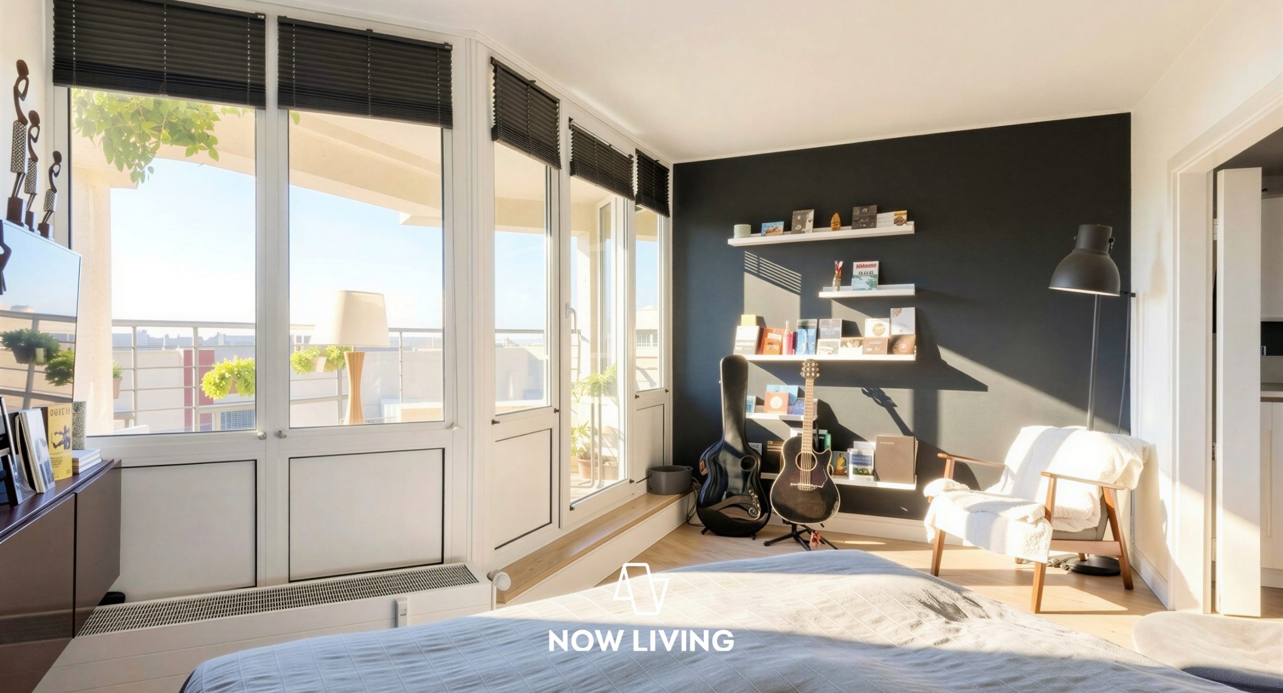 Das Schlafzimmer ist klar geschnitten und bietet direkten Zugang zur Loggia – ein Rückzugsort, der Ruhe und Offenheit gleichzeitig ermöglicht. Der Grundriss erlaubt zudem flexible Nutzungsmöglichkeiten, sei es für Eigennutzung, Wohngemeinschaft oder möblierte Vermietung.